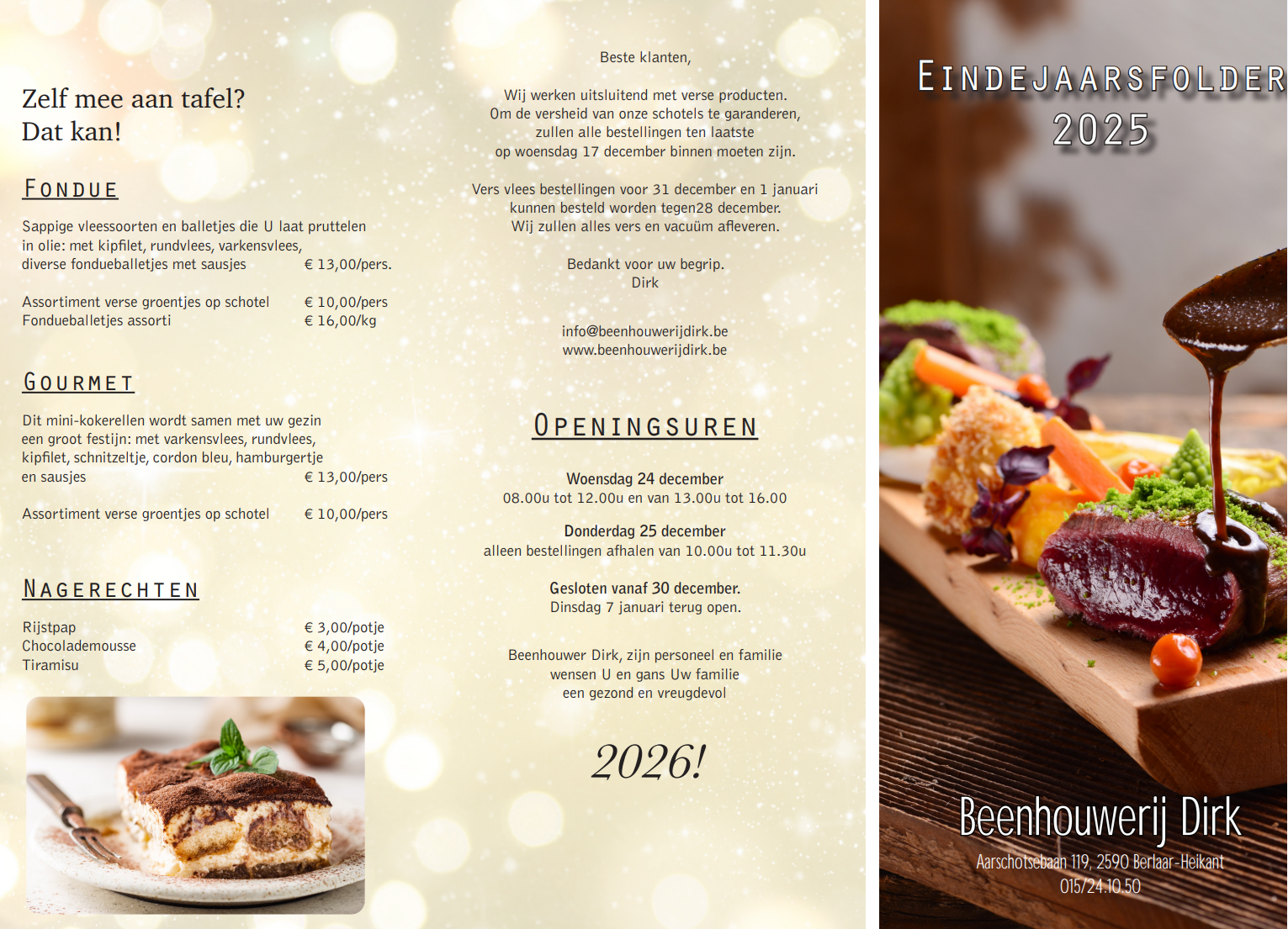 Wilt u graag meer informatie over de verschillende vleessoorten die u teruggevonden heeft in onze feestfolder? Zaakvoerder Dirk en zijn medewerkers helpen u in een mum van tijd verder. U kunt zo ook meteen uw bestelling doorgeven aan onze beenhouwerij.
